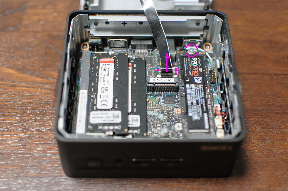 Be gentle. The bottom plate is connected to the motherboard with a ribbon SATA cable. The cable is plugged into a white connector with a small slider (FFC/PFC connector). Use tweezers to gently lift the slider, then pull the ribbon cable out. Also remove the single screw holding the NVMe SSD and pull it out.